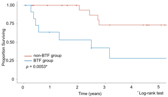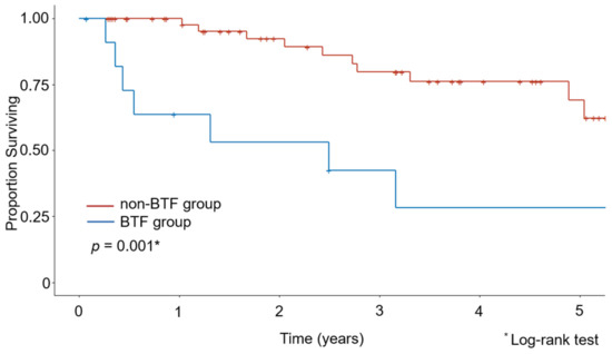 The Kaplan–Meier curves for OS are shown in Figure 1 and Figure 2. The median observation period for survivors was 29.6 months. The non-BTF group had a better 5-year survival rate than the BTF group (67.8% vs. 28.3%, p = 0.001). Even after excluding the patients who had undergone minimally invasive surgery, the non-BTF group had a better 5-year survival rate than the BTF group (73.3% vs. 28.3%, p = 0.005).