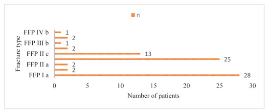 Following the Rommens and Hofmann classification of the FFP, 28 patients had FFP type Ia lesions (unilateral anterior lesions), 2 had FFP type Ib lesions (bilateral anterior lesions), 2 had FFP type IIa lesions (non-displaced sacral crush, without anterior disruption), 25 had FFP type IIb lesions (non-displaced sacral crush, with anterior disruption), 13 had FFP type IIc lesions (non-displaced sacral, sacroiliac or iliac fracture, with anterior disruption), 2 had type IIIa lesions (displaced unilateral iliac fracture), 1 had a type IIIb lesion (displaced unilateral iliosacral disruption), 2 had type IIIc lesions (displaced unilateral sacral fracture), and 1 had a type IVb lesion (bilateral sacral fracture, with spinopelvic dissociation) [10]. The distribution and numbers of FFP type in the patients included in our study (n = 76) are presented in Figure 2.