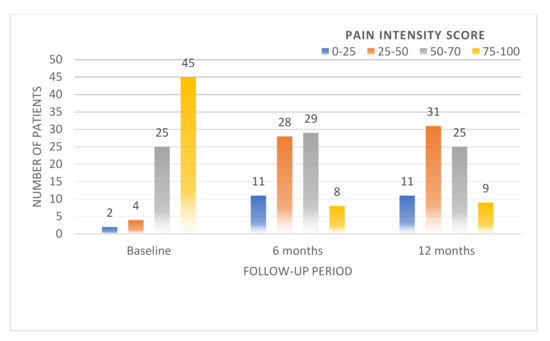 The initial pain intensity score was found to be between 75 and100 in 45 patients (59.2%), between 50 and75 in 25 patients (32.9%), and between 25 and50 in 4 patients (5.3%). Only 2 (2.6%) patients had a score of less than 25 points. Pain severity decreased considerably at the 6-month follow-up, from 59.2% to 10.5% (p < 0.001), and remained elevated at the 1-year follow-up, at 11.8%.