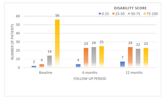 A disability score higher than 75 was reported by 73.7% of the patients in the hospital, 32.9% of the patients at the 6-month follow-up, and by 30.3% of the patients at the 1-year follow-up.