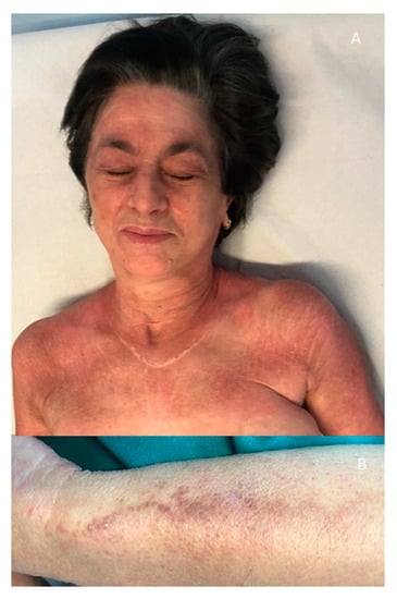 (A) Palpebral edema; heliotropic erythema of face, neck, chest, shoulder and arms. (B) Particular of hyperkeratotic, erythematous, follicular confluent papules arranged in a linear fashion on forearm.