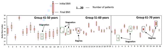 Evolution of body mass index (BMI) during the study at the group A. Stagnation—the value of the parameter obtained at time T1 is the same as the value of the parameter obtained at time T0; Regress—the parameter obtained at time T1 is less than the value of the parameter obtained at time T0.
