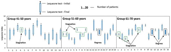 The good evolution of patients in the 41–50 age group is also indicated by the small number of patients in whom the disease has stagnated (the value of the parameter obtained at time T1 is the same as the value of the parameter obtained at time T0), as well as the absence of those who suffered a regression of the disease (the parameter obtained at time T1 is less than the value of the parameter obtained at time T0). This was the only group where no cases of disease regression were recorded, as it can be seen in Figure 2, Figure 3, Figure 4, Figure 5 and Figure 6.
