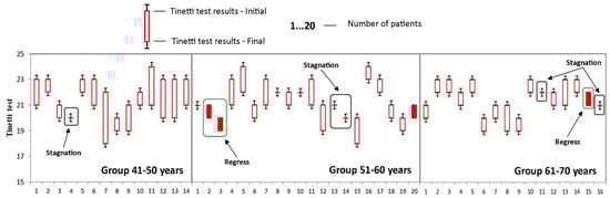 Evolution of Tinetti test during the study at the group A. Stagnation—the value of the parameter obtained at time T1 is the same as the value of the parameter obtained at time T0; Regress—the parameter obtained at time T1 is less than the value of the parameter obtained at time T0.