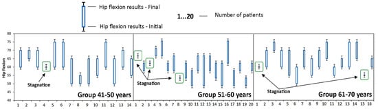Evolution of hip flexion during the study at the group A. Stagnation—the value of the parameter obtained at time T1 is the same as the value of the parameter obtained at time T0; Regress—the parameter obtained at time T1 is less than the value of the parameter obtained at time T0.