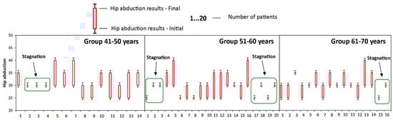 Evolution of hip abduction during the study at the group A. Stagnation—the value of the parameter obtained at time T1 is the same as the value of the parameter obtained at time T0; Regress—the parameter obtained at time T1 is less than the value of the parameter obtained at time T0.