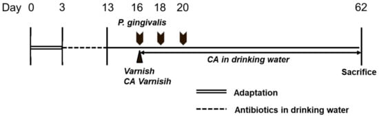 Experimental design. An adaptation period of 3 days was provided, followed by antibiotic drinking water for 10 days. After 3 antibiotic-free days, Varnish and Colocasia antiquorum var. esculenta (CA) varnish were applied to the teeth, and P. gingivalis was inoculated. CA in the drinking water group was provided as distilled water with 0.5 w/v% CA extract. After 62 days, the animals were sacrificed.