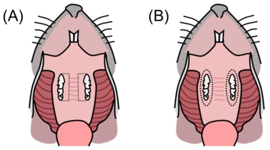 Schematic view of the gingival tissue collection area in the upper jaw of the mouse as expressed with a dotted line. (A) Gingival tissue for oral microbiome analysis, (B) gingival tissue around the maxillary molar for quantitative real-time PCR analysis.