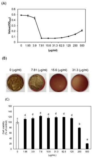 The cytotoxicity of CA was not observed up to 125 μg/mL but significantly increased at 250 μg/mL; however, considering that ISO 10993-5 specifies cell viability less than 70% of the NC as cytotoxic [], a concentration of up to 250 μg/mL is not cytotoxic. It was confirmed that there was no cytotoxicity at the concentration exhibiting effective antibacterial activity. It was shown that CA extract is a potential substance for preventing periodontitis in vitro.