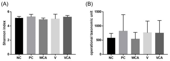 Alpha diversity of the oral microbiome, (A) Shannon index of the mouse gingival tissue microbiome. (B) Operational taxonomic unit (OTU) of the microbiome. There were no significant differences in alpha diversity. NC, negative control; PC, positive control; WCA, water in Colocasia antiquorum var. esculenta (CA) group; V, varnish group; VCA, Varnish with CA group.