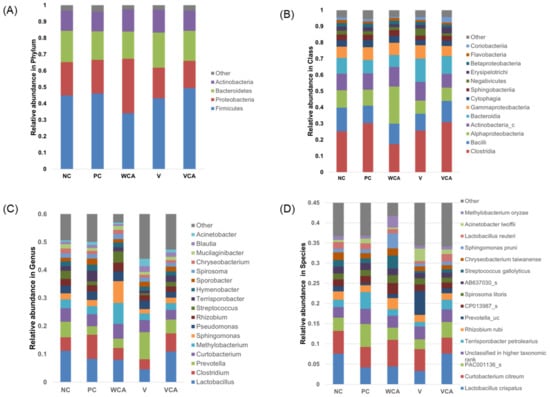 The relative abundance at the phylum, class, genus, and species levels are demonstrated in Figure 5. Bacteria that comprised less than 0.5% of the total bacteria were classified as other. At the phylum level, Firmicutes were the most dominant in all groups. At the class level, Clostridia dominated, followed by Bacilli. At the genus level, Lactobacillus was the most dominant. At the species level, Lactobacillus crispatus was the most dominant in the NC and VCA groups.