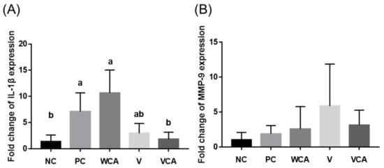 The VCA group showed significantly lower IL-1β expression level than PC and WCA groups (p < 0.05), with no significant differences from the NC and V groups (p > 0.05) (Figure 6A). There were no statistically significant differences in MMP-9 expression between the groups (Figure 6B).