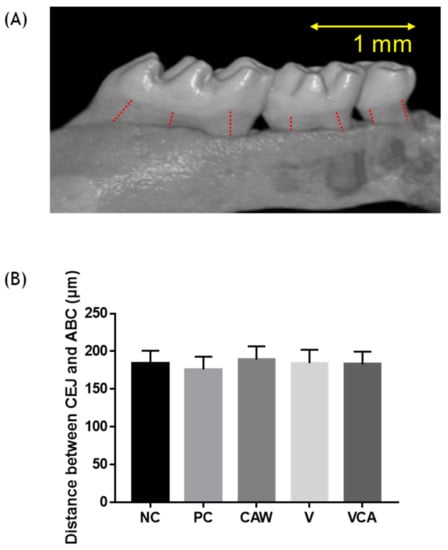 Micro X-ray computed tomography (CT) analysis of alveolar bone loss. (A) The micro-CT image shows the distance between the cemento-enamel junction (CEJ) and the alveolar bone crest (ABC) represented by the dotted line. (B) Alveolar bone loss is expressed as the measured distance of the CEJ to the ABC of the groups. NC, negative control; PC, positive control; WCA, water in Colocasia antiquorum var. esculenta (CA) group; V, varnish group; VCA, varnish in CA group.