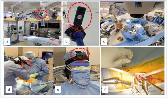 High-resolution videos: 360° cameras (a,b) and surgical videos for spine surgery (c). A video is taken by the GoPro (d,e) from the surgeon’s point of view (f).