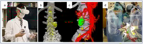 Hologram-based surgical simulation (a–c) and intraoperative guidance (d). (a) Resident doctor with a head-mounted display. (b,c) Relationship between schwannoma and spine and blood vessels in a virtual reality environment (Holoeyes XR). (d) Hologram-based surgical intraoperative guidance (Holoeyes MD).