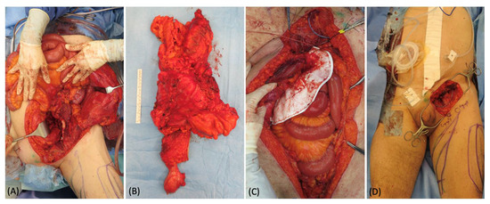 Figure 3. (A) Intraoperative picture of the extensive surgery for the sarcoma removal in the abdomen. (B) 45 × 30 cm specimen. (C) Abdomen reconstruction with a mesh. (D) Appearance of the groin defect at the end of the abdominal surgery.