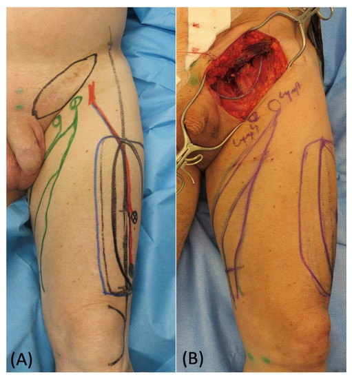 6. Scaglioni, M.F.; Franchi, A.; Giovanoli, P. Pedicled chimeric sensitive fasciocutaneous anterolateral thigh (ALT) and vastus lateralis muscle (VLM) flap for groin defect reconstruction: A case report. Microsurgery 2017, 38, 423–426. [Google Scholar] [CrossRef]