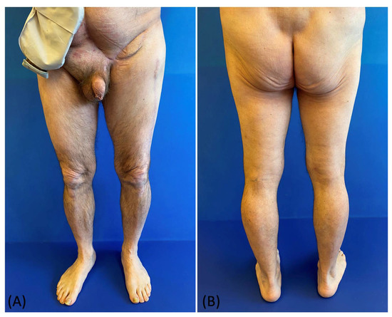 Figure 6. (A,B) Postoperative picture at 6 months follow-up: frontal view and posterior view.