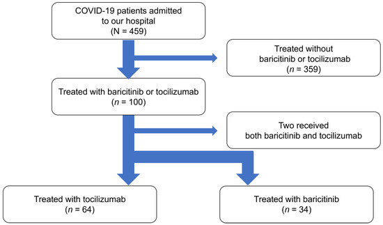 A total of 459 patients diagnosed with COVID-19 were admitted to the Hokkaido University Hospital during the study period. To treat the symptoms of COVID-19, 100 of these patients received either TCZ or BRT, 64 were treated with TCZ (TCZ group), and 34 were treated with BRT (BRT group). Two patients initially received BRT treatment but later received TCZ (Figure 1), and were excluded from the study. Subsequent analyses were performed on the remaining 98 individuals.