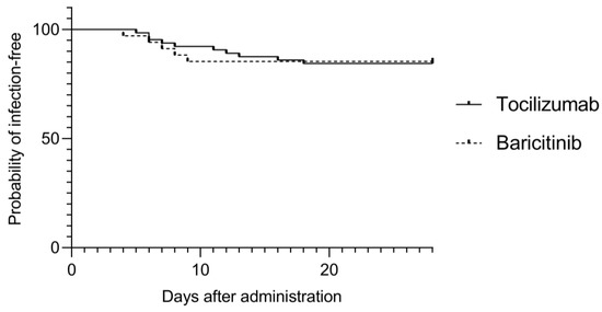 Kaplan–Meier estimates of secondary infection free survival between tocilizumab and baricitinib groups.