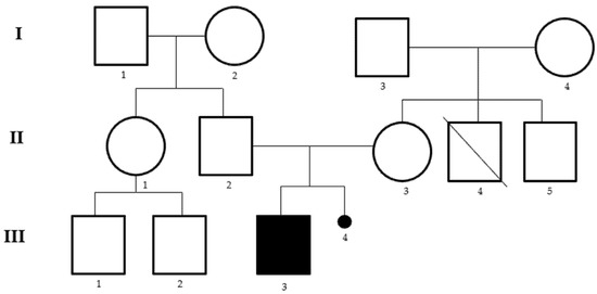 We report the case of a child aged 2 years and 8 months, born from healthy unrelated parents, with a diagnosis of psychomotor developmental delay, mainly in the area of communication and language. The proband was born in the thirty-seventh week of gestation by caesarean section, and the mother reports a threat of abortion in the first trimester and a miscarriage that occurred in a previous pregnancy. The mother was affected by pituitary microadenoma and the grandmother by ovarian cancer at 29 years. The parents report the presence in the family of a maternal uncle with psychiatric problems, who died of acute myocardial infarction (Figure 1). The patient began to take their first steps at the age of 11 months and currently has not yet acquired control of the sphincters and does not say a word. From the age of 18 months, the child has been followed by pediatric neuropsychiatry due to the absence of language and hyperactivity. The electroencephalogram (EEG) reveals brain electrical activity in sleep within normal limits, as well as the ABR (Auditory Brainstem Response) and echo-abdomen test. Physical examination revealed low hairline, wide auricles and feet: clinodactyly of the 4th and 5th toes bilaterally, syndactyly of the 2nd and 3rd toes, large hallux, bilateral flat foot and valgus knees. Furthermore, tone and trophism are normal, and the cranial nerves are unaffected. Currently, the child practices psychomotor and speech therapy twice a week and attends kindergarten without school support and a good interaction with his peers is reported.