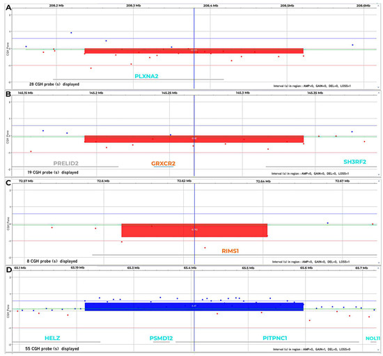 Molecular analysis was conducted on DNA of the proband, and his parents extracted this from peripheral blood, with the extraction kit, Maxwell RSC Blood DNA Kit (Promega, Madison, Wisconsin, USA), using the a-CGH platform 4 × 180 K SurePrint G3 Human CGH Microarray (Agilent Technologies, Santa Clara, CA, USA), with an average spacing of 13 kb, allowing an average resolution of 25 kb. The microarray was scanned on an Agilent G2600D scanner. Image files were quantified, and data were visualized by using Agilent’s Cytogenomics software version 4.0.3.12 (Agilent Technologies, Santa Clara, CA, USA). The human assembly utilized was GRCh37, hg19 (http://www.ensembl.org/, last accession 1 April 2022). The a-CGH analysis showed the presence of a heterozygous de novo deletion on chromosome 1, in the q32.2 region, ranging from position 208236806 to 208521372, with an extension of 284.57 kb, partially involving the Plexin A2 (PLXNA2) (RefSeq # NC_000001.11) gene (Figure 2A), the presence of a heterozygous de novo deletion on chromosome 5, in the q32 region, ranging from position 145191813 to 145342040, with an extension of 150.23 kb, partially involving PRELI Domain Containing 2 (PRELID2), Glutaredoxin and Cysteine Rich Domain Containing 2 (GRXCR2) and partially SH3 Domain Containing Ring Finger 2 (SH3RF2) (RefSeq # NC_000005.10) genes (Figure 2B). Furthermore, we also observed the presence of a heterozygous de novo deletion on chromosome 6, in the q13 region, ranging from position 72605565 to 72651412, with an extension of 45.85 kb, involving the intron 1 of Regulating Synaptic Membrane Exocytosis 1 (RIMS1) (RefSeq # NC_000006.12) gene (Figure 2C) and the presence of a heterozygous duplication of maternal origin on chromosome 17, in the q24.2 region, ranging from position 65214693 to 65596540, with an extension of 381.85 kb, partially involving Helicase With Zinc Finger (HELZ), Proteasome 26S Subunit, Non-ATPase 12 (PSMD12), partially Phosphatidylinositol Transfer Protein Cytoplasmic 1 (PITPNC1) (RefSeq # NC_000017.11) genes (Figure 2D).