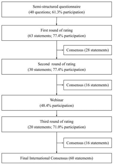 An international consensus was developed after a narrative review was used to create a semi-structured questionnaire, which was distributed to a panel of 31 experts. Responses to the semi-structured questionnaire were used to create initial statements. The statements then underwent 3 rounds of rating to reach consensus. For each step, the percent participation is shown, along with the number of initial questions or statements presented to the panelists in that step. The number of statements that reached consensus after each round of rating is also shown.