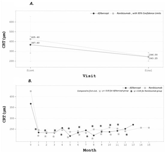 After anti-VEGF treatment, mean final CRT decreased significantly from 396.60 ± 135.64 to 244.63 ± 20.29 μm (p < 0.05). From serial follow-up data, CRT significantly decreased beginning from the first month of follow-up in both groups (Figure 1).