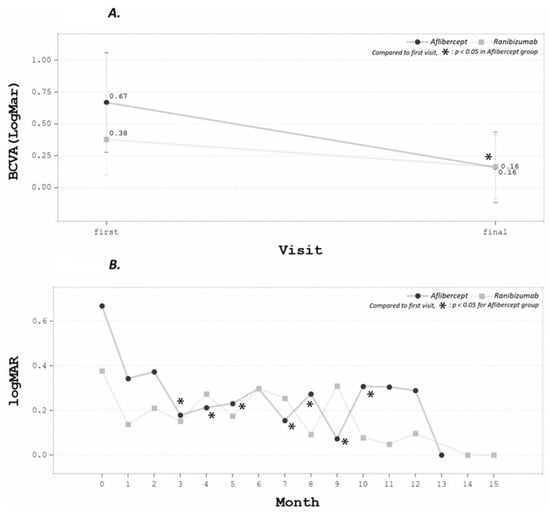 Overall, the mean final LogMAR BCVA improved significantly from 0.52 ± 0.30 to 0.16 ± 0.20 (p < 0.05). The improvement was more prominent in the aflibercept group (Figure 2A). From serial follow-up data, BCVA significantly improved beginning from the first month of follow-up, although a subgroup analysis found that the improvement mainly occurred in the aflibercept group (Figure 2B).