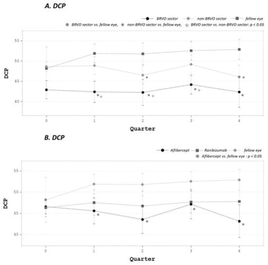 (A) DCP in BRVO sectors remained low after the initiation of treatment and reached significance compared with non-BRVO sectors and fellow eye (p < 0.05). (B) In subgroup analysis, the significance was mostly in the aflibercept group.