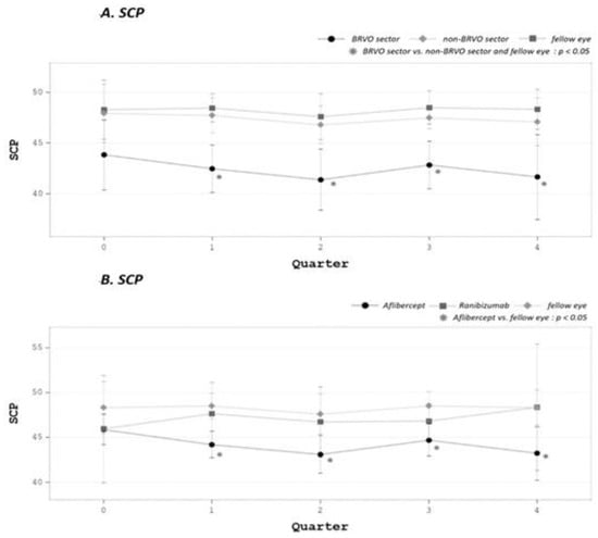 (A) SCP in BRVO sectors remained low after the initiation of treatment and reached significance compared with non-BRVO sectors and fellow eye (p < 0.05). (B) In subgroup analysis, the significance was mostly in the aflibercept group.