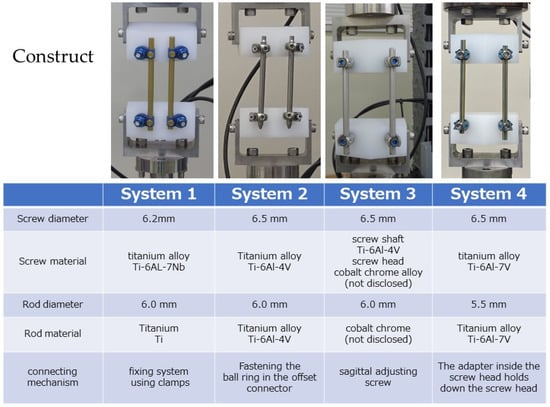 - System 4—general PPS system, screw diameter: 6.5 mm, rod material: Ti-6Al-4V, rod diameter: 5.5 mm, rod material: Ti-6Al-4V, connecting mechanism: a mechanism where the adapter inside the screw head holds down the screw head.