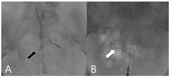 The CEI techniques were performed following the standardized protocol previously described by Yoon et al. []. All procedures were performed by an interventional radiologist (Y.-C.H.) with more than 10 years of experience in musculoskeletal US and epidural injection. US was performed using a scanner (Xario 100; Toshiba, Tokyo, Japan) with a 7–18 MHz linear transducer or a 1–6 MHz curve transducer in obese patients. In order to avoid intravascular injection, which may cause devastating complication such as paraplegia, standardized US-guided and fluoroscopy-assisted techniques have been routinely included in our protocol since 2015 []. The ultrasound machine was routinely arranged next to a digital angiography system (ARTIS Q; SIEMENS, Munich, Germany). These patients were prepared using a hygienic technique in the prone position. First, we palpated the sacral hiatus. We transversely placed the US probe in the center to identify the sacral hiatus. At this stage, the ultrasound transducer was rotated 90° to obtain the longitudinal view of the sacral hiatus. A 23G injection needle was inserted into the sacral hiatus. The loss-of-resistance technique was utilized while penetrating the sacrococcygeal ligament and seating the needle tip in the epidural space. After the needle in the epidural space was confirmed on gray-scale US, we verified the absence of blood in the syringe and applied negative pressure to ensure that no blood or cerebrospinal fluid was aspirated. If blood appeared in the needle hub, it was removed, and the needle was repositioned in a different site. A test dose of 0.5 mL of 5% dextrose in water was injected under PDU based on a previous study published in 2019 []. The radiographer next to the interventional radiologist was asked to initiate ultrasound recording when the needle was inserted into the sacral canal and when the test solution was injected. Two 5 s videos were captured and saved into a picture archiving and communication system (PACS). Then, the operator captured the image of maximal power doppler amplitudes in the canal, which were saved into the PACS. Furthermore, intra-epidural injection or intravascular injection was confirmed via fluoroscopy with contrast medium (Omnipaque 300 mg/mL; 1–2 mL) injection []. (Figure 1) Once the proper position was confirmed, 7.5 mL of solution (2.5 mL 10 mg/L triamcinolone and 5 mL of water) or 7.5 mL of 5% dextrose was used for epidural injection.