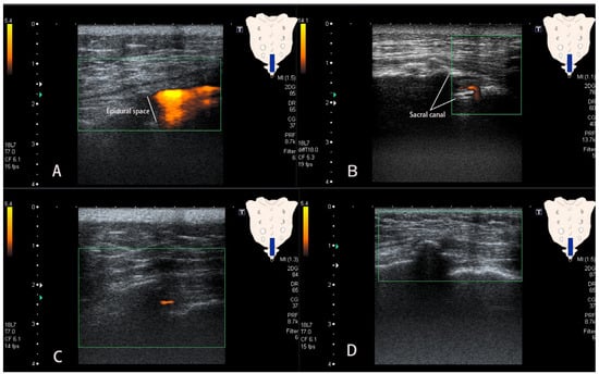 - Tsui, B.; Leipoldt, C.; Desai, S. Color flow Doppler ultrasonography can distinguish caudal epidural injection from intrathecal injection. Anesth. Analg. 2013, 116, 1376–1379. [Google Scholar] [CrossRef] [PubMed]