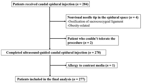 From January 2019 to December 2019, 284 patients received US-guided CEI. Patients were excluded if visualization of the needle tip in the epidural space under ultrasonography was not possible or if contrast fluoroscopy was contraindicated. Four patients were excluded due to the inability to visualize the needle tip in the epidural space (ossification of the sacrococcygeal ligament, obesity-related), one could not undergo fluoroscopy because of an allergy to the contrast medium, and two could not undergo the US-guided procedure due to severe back pain. A total of 277 patients were included in the study. A complete patient selection flow diagram is shown in Figure 3.