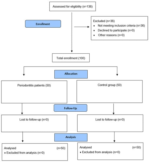 A total of 100 generally healthy adult participants within normal BMI (50 diagnosed with periodontitis, 50 with healthy periodontium) were enrolled in the study. None of the participants took any antibiotics for the past 6 months or any nonsteroid anti-inflammatory drugs, corticosteroids or multivitamin supplements within the last 3 months. They had to be nonsmokers who were free from caries, epithelial dysplasia and inflammatory lesions of the oral mucosa. Pregnancy and receiving periodontal treatment, pharmacologic or radiologic therapy in the prior 6 months before the study were also added to the exclusion criteria. The diagnosis of periodontitis was based on the clinical and radiologic examination in accordance with the 2017 World Workshop on the Classification of Periodontal and Peri-Implant Disease and Conditions []. Staging (I–IV) intends to classify the severity and extent of a patient’s disease based on the measurable amount of destroyed tissue as a result of periodontitis and to assess the specific factors that may attribute to the complexity of long-term case management. Initial stage is determined using clinical attachment loss (CAL). One or more complexity factors may shift the stage to a higher level []. Grading aims to indicate the rate of periodontitis progression [].