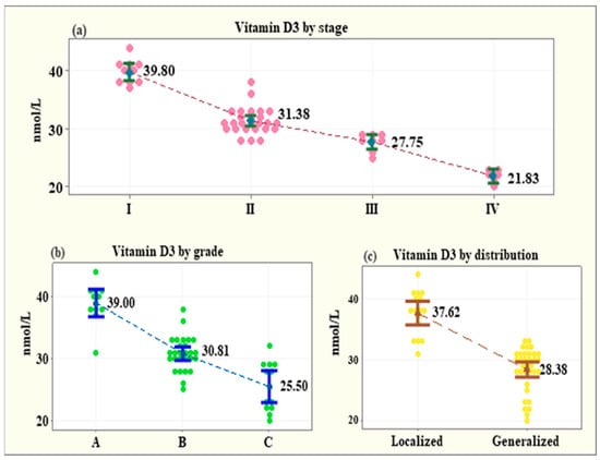 The grade (A, B and C) and the distribution of periodontitis (localized, generalized) were entered as covariates in a generalized linear model and a similar trend was observed. With grade and distribution as covariates, the mean vitamin D3 levels presented a significant reduction from Grade A to Grade C: Grade A (14 patients)—39.00 ± 3.31 nmol/L; Grade B (19 patients)—30.81 ± 2.76 nmol/L; Grade C (12 patients)—25.50 ± 4.03 nmol/L (p < 0.001) (Figure 2b). Additionally, the patients with generalized periodontitis had significantly lower mean level of vitamin D3 (28.38 ± 3.57 nmol/L, p < 0.001) in comparison with the patients with localized disease (37.63 ± 3.63 nmol/L, p < 0.001) (Figure 2c).