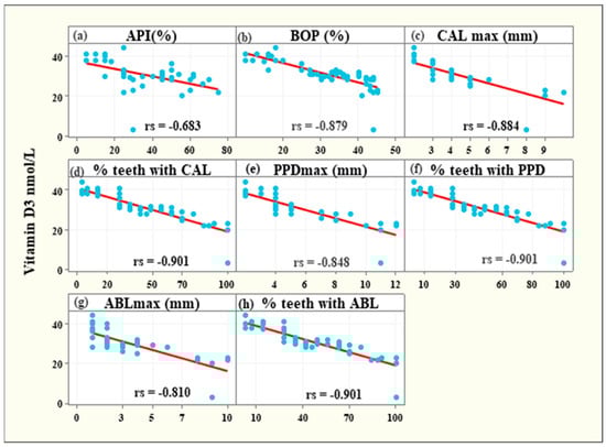 Strong negative associations between vitamin D3 levels and API (a), BOP (b), CALmax (c), % teeth with CAL (d), PPDmax (e), % teeth with PPD (f), ABLmax (g) and % teeth with ABL (h).