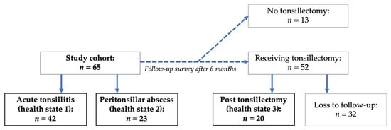 A total of 65 participants could be included. Overall, 42 patients were included in health state 1 and 23 patients in health state 2. Of these 65 participants, 52 underwent tonsillectomy and were contacted by either phone or mail (depending on their choice) again six months postoperatively. With a response rate of 38.5%, 20 participants answered the questionnaire six months postoperatively. Their responses six months postoperatively were summarized as health state 3. See Figure 2 for the inclusion process.