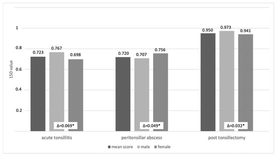 In addition, the groups differed significantly in their gender and age distribution, with the peritonsillar abscess health state sample being slightly older and including more male participants. There is evidence that age may influence 15D questionnaire scores, with a slight tendency for a decrease in scores associated with increasing age []. Based on our cohort, which had a rather narrow age distribution (mean ages ranging between 25.4 years and 34.7 years), the potential decreases in HRQoL due to age are expected to be small. Gender differences are very specific according to the disease studied. Changes in HRQoL outcomes after tonsillectomy may considerably vary depending on the study cohort and the questionnaire used. In surveys using the GBI or the Adult Tonsil Outcome Inventory, gender had no effect on HRQoL outcomes [,]. On the other hand, Plath et al. found that female gender resulted in higher socioeconomic item subscores when using the Tonsillectomy Outcome Inventory 14 []. Other subscores were not affected by gender. The difference in mean utility between both genders was above the minimal important change of 0.015 and was therefore considered to be significant. With more male participants, the health utility in the peritonsillar abscess health state might be underestimated. To facilitate interpretation of these results, we reported health utility as mean scores and separately by gender.