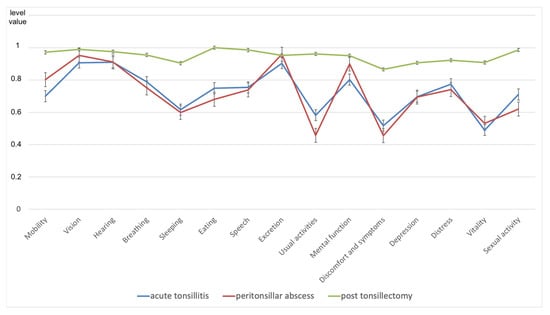 The 15D questionnaire was used by Wiksten et al. to measure changes in HRQoL before and after tonsillectomy []. A cohort of 124 participants included patients with chronic tonsillitis, enlarged tonsils causing snoring or swallowing problems and recurrent tonsillitis or abscess. The authors found no significant differences in HRQoL among these groups, which is consistent with the results of our study. The items Breathing, Sleeping, Discomfort and symptoms and Vitality were significantly impaired in their cohort before surgery. Nonetheless, the reported overall utility before tonsillectomy was 0.939 in their study, a significantly higher value than the one found in our study. This may be due to the fact that the largest patient group in their baseline cohort had only enlarged tonsils without any infectious focus. There were only a few (n = 13) participants with recurrent acute tonsillitis or abscesses in their study. The HRQoL 6 months after tonsillectomy was 0.956, which is in line with our results. Although their total baseline cohort was larger than ours, it appears that—based on our present findings—any acute tonsillar inflammatory state (including its complications, e.g., abscess) causes a significant decrease in HRQoL. Therefore, it may be suggested that chronic, non-inflammatory tonsillar conditions are associated with much higher utility values than inflammatory conditions are.