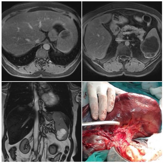 Magnetic resonance imaging and intraoperative finding. Two well-circumscribed round lesions of the spleen, T1 weighted—hypointense, T2 weighted—bright, and hyperintense—with peripheral signal enhancing and small endophytic lobulization of the bigger lesion.