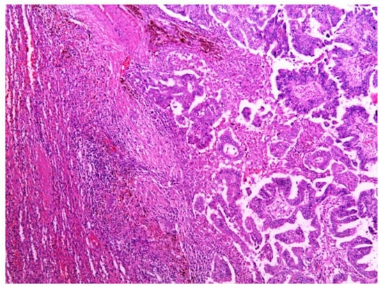 Total abdominal exploration was carried out, but it yielded no other pathological findings. There was no regional lymphadenopathy. The patient underwent a classic splenectomy. Spleen dimensions were 14 cm × 12 cm × 9 cm, and it weighed 650 g. The spleen capsule was intact, but a large part of the parenchyma was involved by two solid and partly colliquated necrotic tumors with irregular borders. The dimensions were similar to the preoperative measurements. Surgical biopsies were fixed in 10% formaldehyde overnight, processed in paraffin wax, and cut at 4 μm. The sections were stained with hematoxylin and eosin, periodic acid—Schiff (PAS)—Alcian Blue, van Gieson, and immunohistochemical avidin biotin complexes. Microscopic examination of the splenic tumor confirmed metastatic adenocarcinoma compatible with endometrial origin (Figure 2).