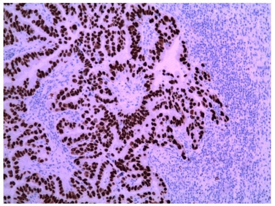 Metastatic endometrial papillary serous carcinoma. Strong diffuse p53 nuclear immunoreactivity was observed in the neoplastic cells. Magnification: 100×.