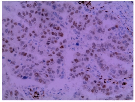 The immunohistochemical examination was positive for p53 (Figure 3) and vimentin WT-1 in the tumoral cells (Figure 4) but negative for estrogen receptor (Figure 5). These findings were similar to the immunohistochemical examination of the hysterectomy piece from the previous surgery. The postoperative recovery was uneventful, and the patient was discharged on the 11th postoperative day.