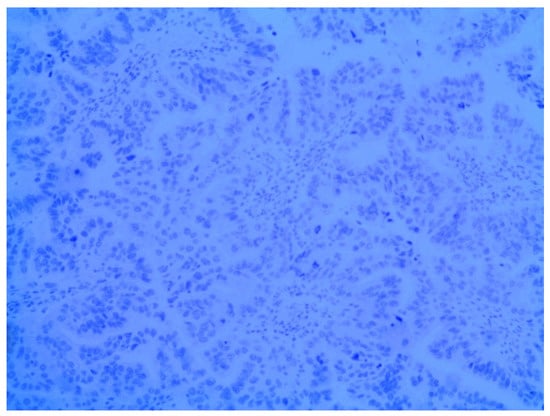 Negative nuclear immunoreactivity in the neoplastic cells to estrogen receptor α. Magnification: 100×.