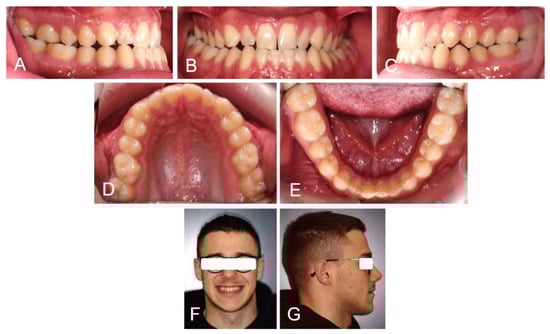 Intra and extra-oral pictures of the patient at the end of treatment: Right lateral occlusion (A); Frontal occlusion (B); Left lateral occlusion (C); Upper arch (D); Lower arch (E); Patients smile (F) and profile (G).