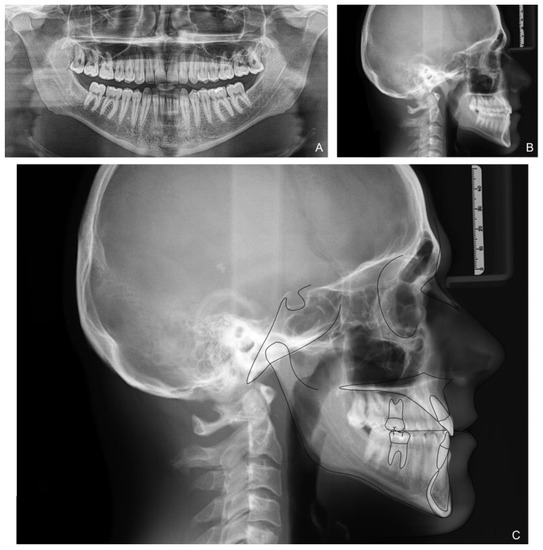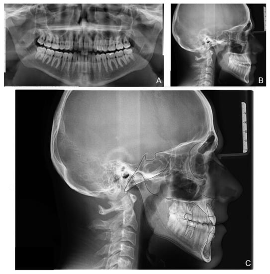 Patient X-rays, cephalometry tracing and analysis before treatment: panoramic X-ray (A); latero-lateral X-ray of the skull before treatment (B); Cephalometric tracing (C).