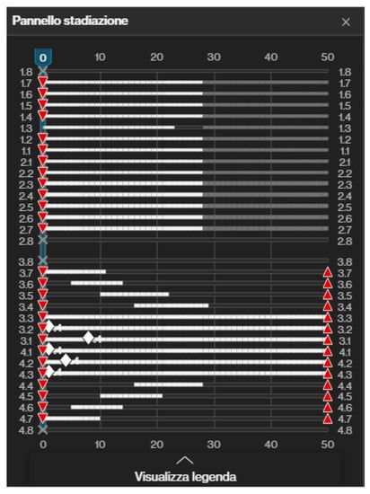 Invisalign® (Align Technology, Tempe, AZ, USA) software staging table where it is possible to appreciate the “ladder” scheme of distalization. In the upper arch all teeth were moved at the same time. In the lower arch, lower teeth were distalized in a sequential way, while anterior teeth were moved from the beginning. Red triangles mean that all teeth had attachments.