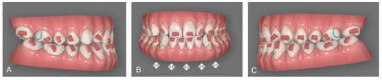 The orthodontic setup included the sequential staging of movements (Figure 3); the second molars were distalized first, and after 50% of their movement, the movement of the first molars began. The planned distalization was 2 mm on the right side and 1 mm on the left side. Once the distalization of the second molar was completed, the distalization of the second premolar began. In the same pattern, all the lower elements were distalized. A slight expansion of the upper and lower arches was necessary to allow the crowding to resolve. In addition, mild proclination of the upper anterior teeth was planned to create spaces distal to the upper lateral incisors.